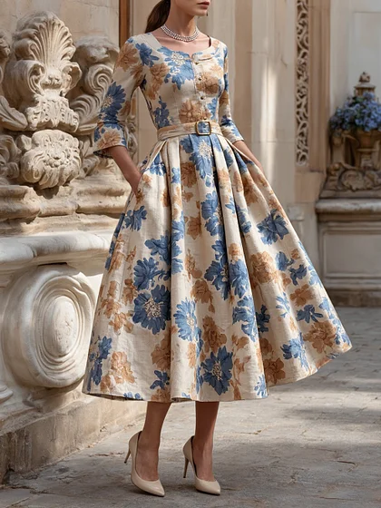 Japanese Art Chrysanthemum Print Crew Neck Casual Midi Dress