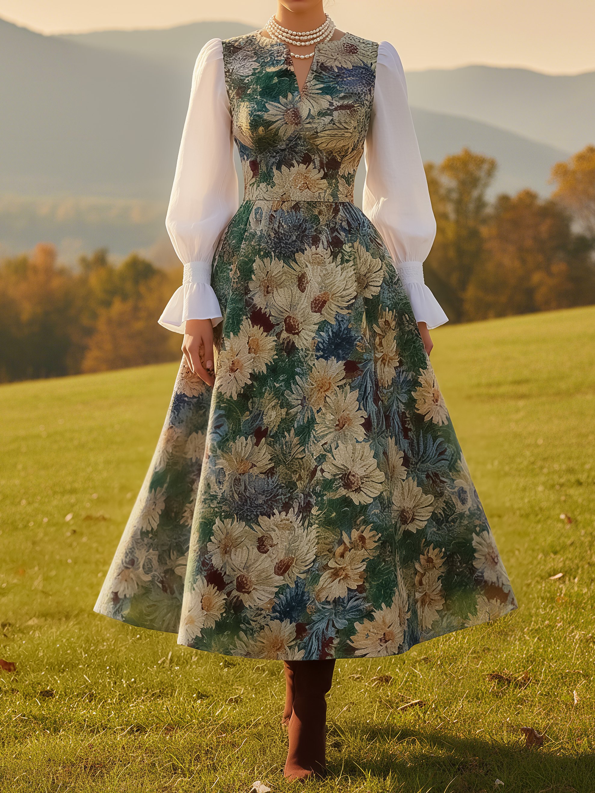 Midi Linen Dress, Long Sleeves, V Neck, Floral, Vintage, Cyan