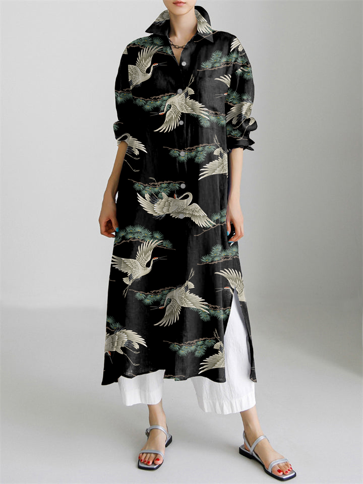 Japanese Cranes & Pine Art Pattern Long Sleeve Slit Shirt Dress