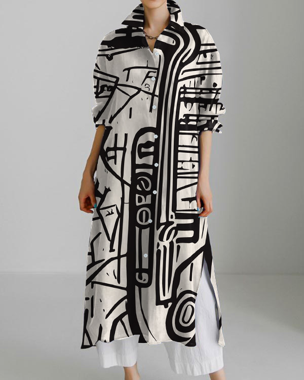 Musicians Festival Art Art Print Cotton and Linen Long Sleeve Slit Shirt Dress