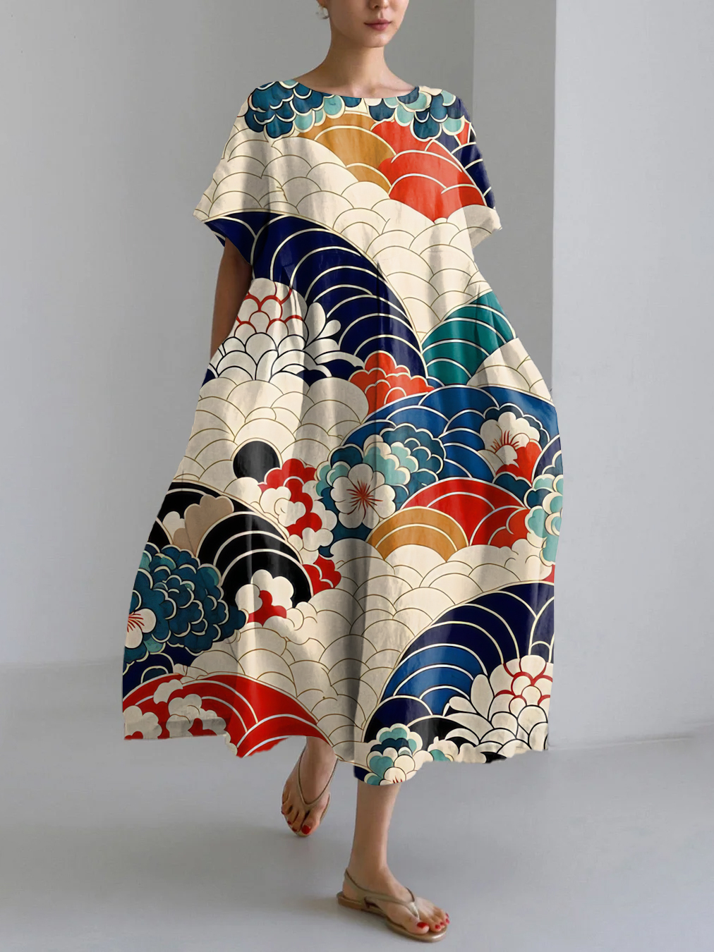 Vintage Japanese Floral Wave Ukiyo-e Art Print Linen Blend Maxi Dress