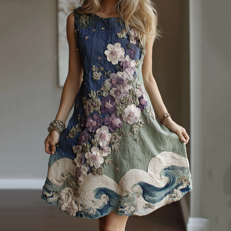 Women's Classy Gradient Japanese Sakura Cherry Blossoms And Sea Wave Embroidered Cotton And Linen Tank Dress