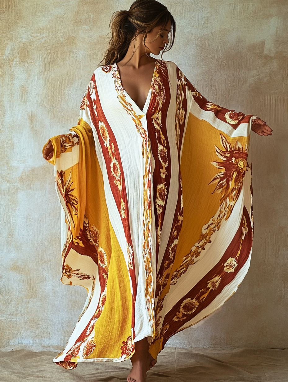 Women's Ethnic Symphony Art Flower Linen V-Neck Long Gown